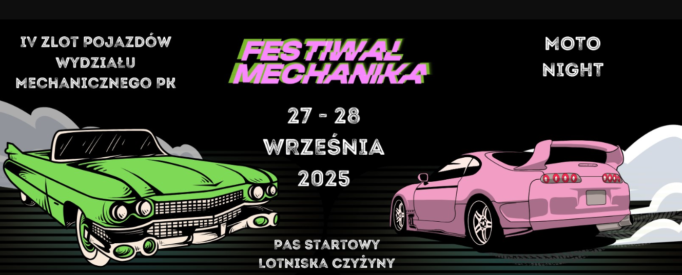 Festiwal Mechanika 2025 to wielkie święto motoryzacji – otwarte dla wszystkich jej fanów: mieszkańców Krakowa i okolic, całych rodzin, dla studentów i pracowników PK oraz i tych, którzy myślą o studiach mechanicznych na Politechnice Krakowskiej. Wydarzenie obejmuje dwa dni różnorodnych aktywności. W sobotę odbędzie się wieczorny zlot aut sportowych oraz tuningowanych, a w niedzielę będzie dzień pełen motoryzacyjnych klasyków, technologii, edukacyjnych atrakcji i rozrywki dla wszystkich pokoleń.