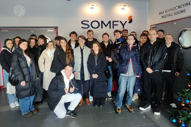 Somfy to lider w dziedzinie inteligentnych rozwiązań dla budynków — od napędów i sterowników do bram po systemy automatyzacji rolet i żaluzji. W trakcie wizyty studenci mieli możliwość poznania organizacji procesów produkcyjnych, stosowanych rozwiązań technologicznych oraz zasad zarządzania produkcją w przedsiębiorstwie o międzynarodowym zasięgu. Bezpośredni kontakt z praktyką umożliwił studentom Wydziału Mechanicznego lepiej zrozumieć zagadnienia omawiane podczas zajęć dydaktycznych oraz dostrzec ich realne zastosowanie. Podczas spotkania uczestnicy poznali historię Sopem, zakres działalności firmy oraz jej strategiczne znaczenie w strukturze Somfy. Studenci mieli również okazję porozmawiać z przedstawicielami działów jakości, B+R oraz HR, co pozwoliło im lepiej zrozumieć różnorodne ścieżki rozwoju zawodowego w branży. Dużą wartością była również możliwość wejścia do pomieszczeń testowych, gdzie produkty przechodzą różnorodne próby jakościowe i wytrzymałościowe.