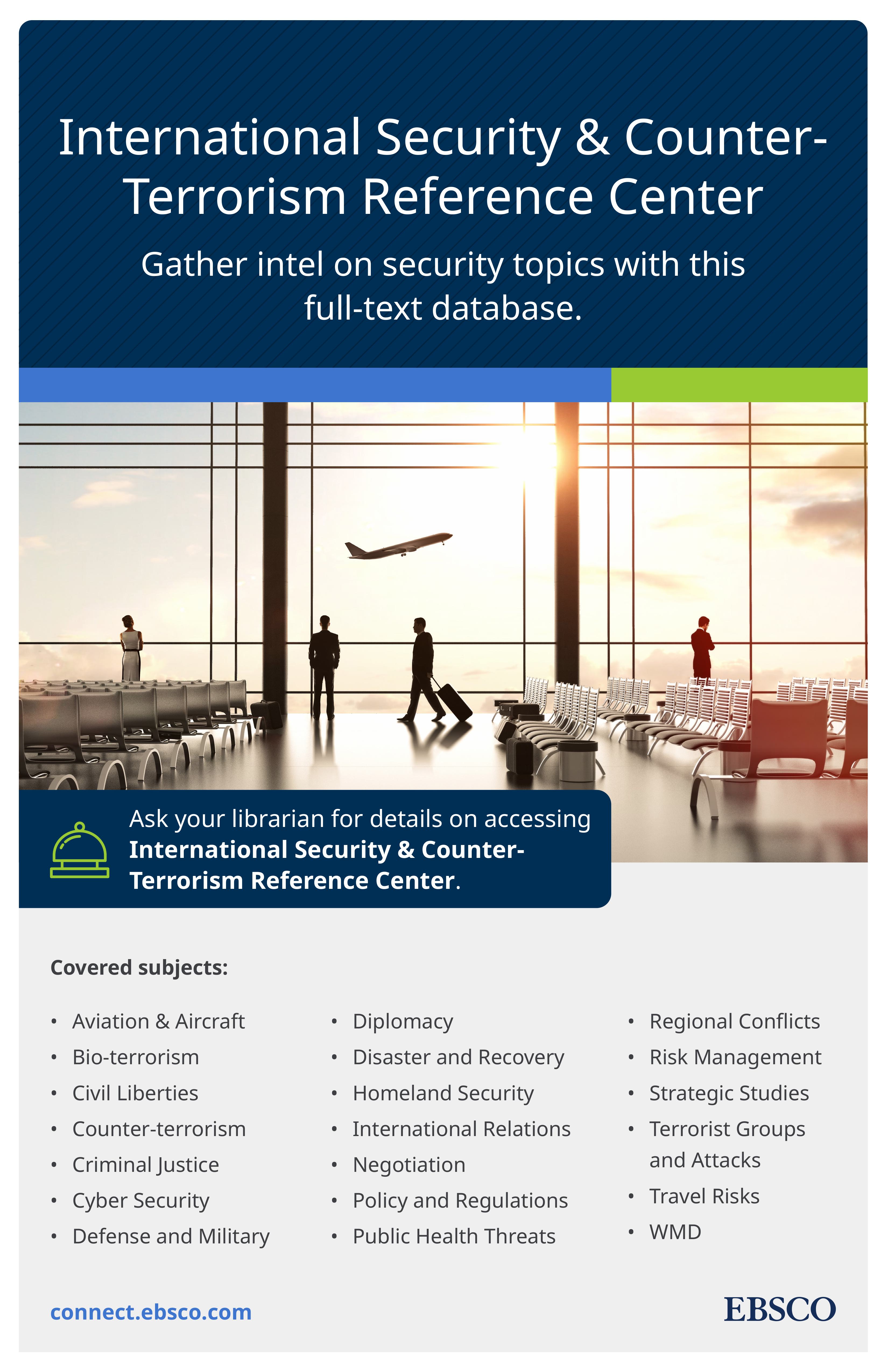 International Security & Counter-Terrorism Reference Center łączy naukowo recenzowane czasopisma z komentarzami ekspertów z różnych organizacji, agencji i wydawców. Zawiera aktualne przeglądy ostatnich wydarzeń w międzynarodowym spektrum politycznym, wojskowym, gospodarczym, społecznym i technicznym.