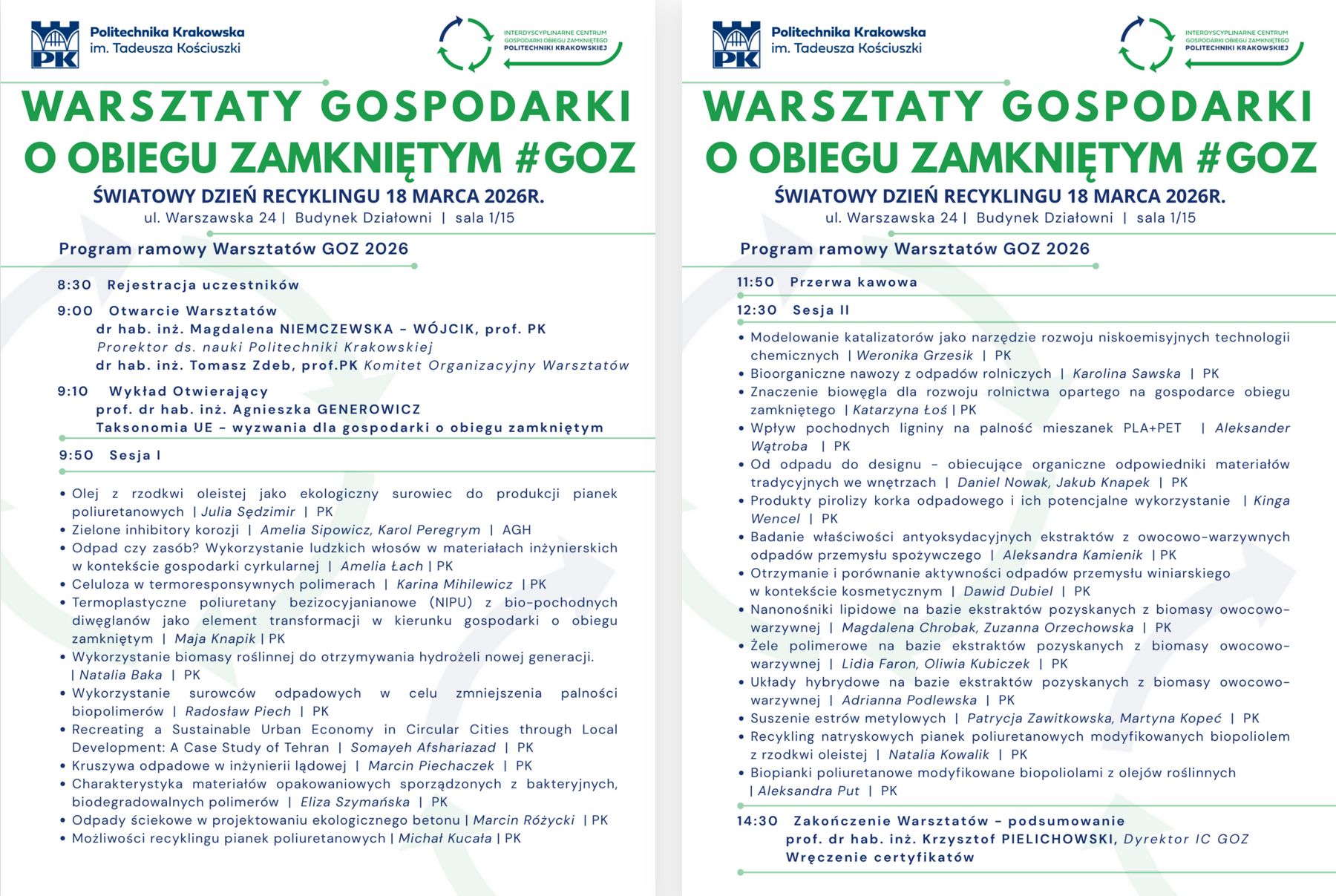 W programie m.in. wykład prof. Agnieszki Generowicz oraz ponad 20 wystąpień młodych naukowców, prezentuujących szeroki wachlarz tematów badawczych podejmowanych na Politechnice Krakowskiej w obszarze gospodarki cyrkularnej.