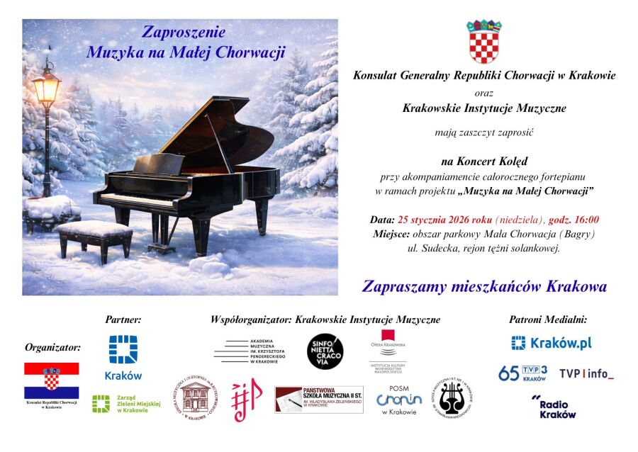 Koncert kolęd odbędzie się 25 stycznia, o godz. 16.00, na terenie obszaru parkowego Mała Chorwacja, zlokalizowanego w Parku Miejskim Bagry przy ul. Sudeckiej, w rejonie tężni solankowej. Podczas koncertu będzie można się ogrzać gorącą herbatą. Wydarzenie będzie pierwszym koncertem w ramach całorocznego projektu „Muzyka na Małej Chorwacji”, którego celem jest popularyzacja muzyki oraz umożliwienie mieszkańcom Krakowa udziału w koncertach plenerowych.