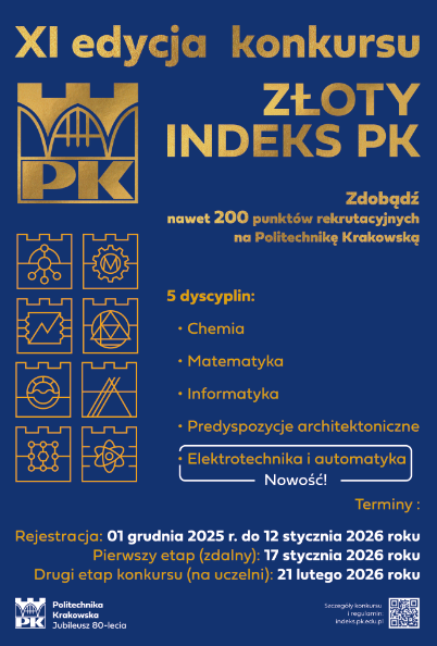 Po raz 11. Politechnika Krakowska i Dział Spraw Studenckich zapraszają do udziału w konkursie „O Złoty Indeks PK”.Rywalizacja będzie odbywać się w zakresie pięciu przedmiotów: matematyki, chemii, informatyki, predyspozycji architektonicznych oraz – po raz pierwszy w historii – elektrotechniki i automatyki. Rejestracja elektroniczna potrwa od 1 grudnia br. do 12 stycznia 2026 r. W zależności od uzyskanych wyników, laureaci mogą zdobyć 200, 100 lub 60 dodatkowych punktów w rekrutacji na Politechnikę Krakowską.