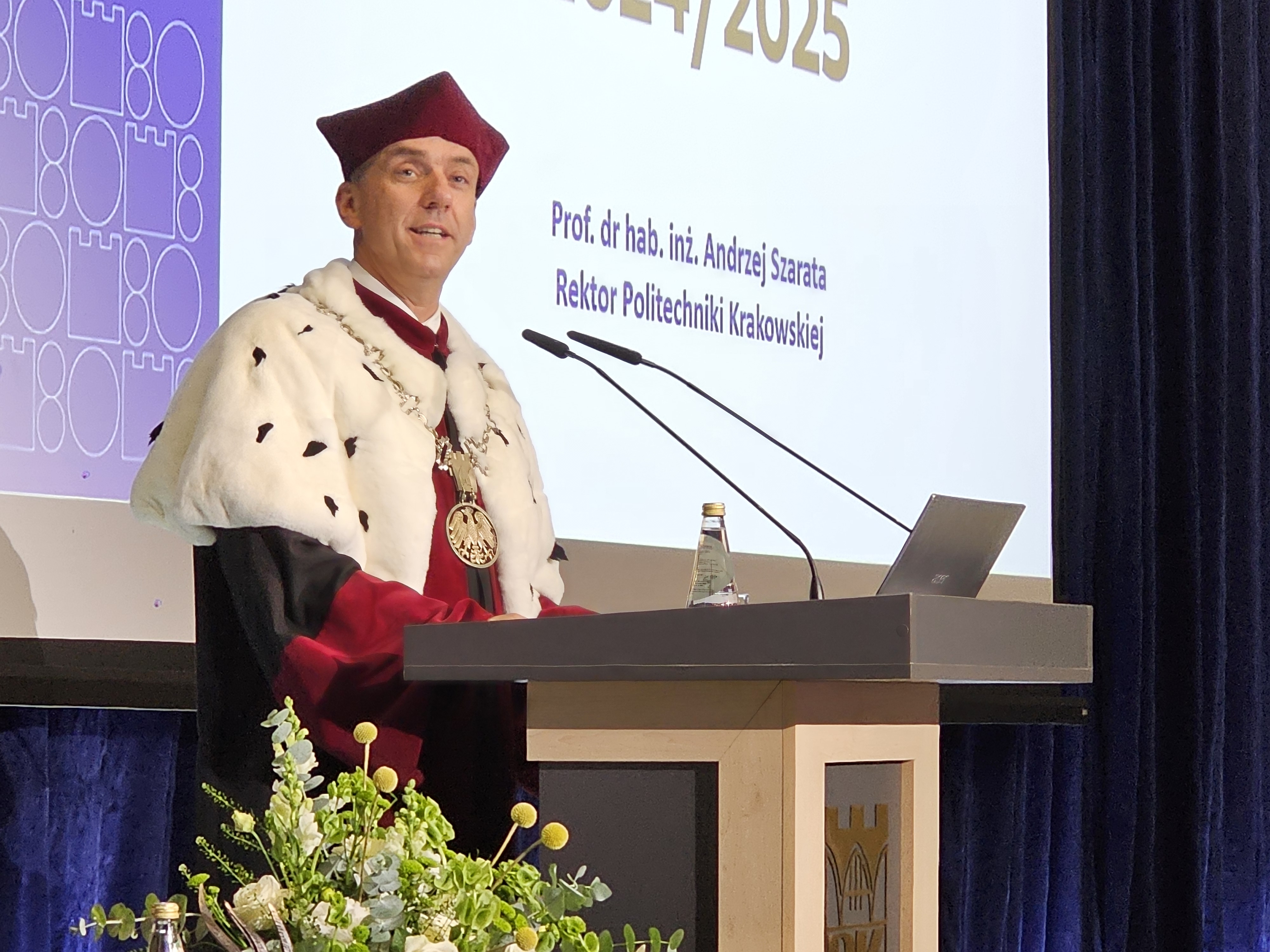 Rektor prezentował m.in. przełomowe badania prowadzone przez naukowców Politechniki, w tym tak ważne jak prace nad terapiami na raka (jelita grubego, prostaty czy glejaka), wykorzystaniem rzeczywistości wirtualnej i sztucznej inteligencji i w medycynie, ochronie przeciwpowodziowej, nowoczesnym projektowaniu, czy projekty poświęcone energetycznej transformacji z wykorzystaniem wodoru i odnawialnych źródeł energii, magazynowanej w innowacyjny sposób. Podkreślał doniosłość partnerstw uczelni na szczeblu międzynarodowym m.in. z Europejską Organizacją Badan Jądrowych CERN oraz inicjatywą Poland in Silicon Valley Center for Science, Innovation, and Entrepeneurship. Wykład inauguracyjny podczas uroczystości na PK wygłosił w tym roku prof. Christoph Schäfer, naukowiec związany od 1999 r. z Europejską Organizacją Badań Jądrowych, gdzie pełnił wiele ważnych funkcji m.in. starszego doradcy dyrektora generalnego, odpowiedzialnego za stosunki z państwami niebędącymi członkami CERN oraz stowarzyszonymi państwami członkowskimi w Europie i Azji Środkowej. W prezentacji pt. „„CERN: A marvel of technology to explore the laws of the universe” prof. Schäfer mówił m.in. o dokonaniach i planach CERN-u na dalsze odkrywanie tajemnic wszechświata, a także o wkładzie w jego rozwój naukowców Politechniki Krakowskiej, współpracujących z CERN od ponad 30 lat.
