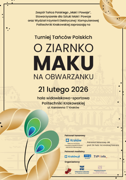 21 lutego br. w Krakowie na Hali widowiskowo-sportowej Politechniki Krakowskiej przy ul. Kamiennej 17 odbędzie się Turniej Tańców Polskich "O ziarnko maku na obwarzanku", którego współorganizatorami są Politechnika Krakowska oraz Wydział Inżynierii Elektrycznej i Komputerowej.